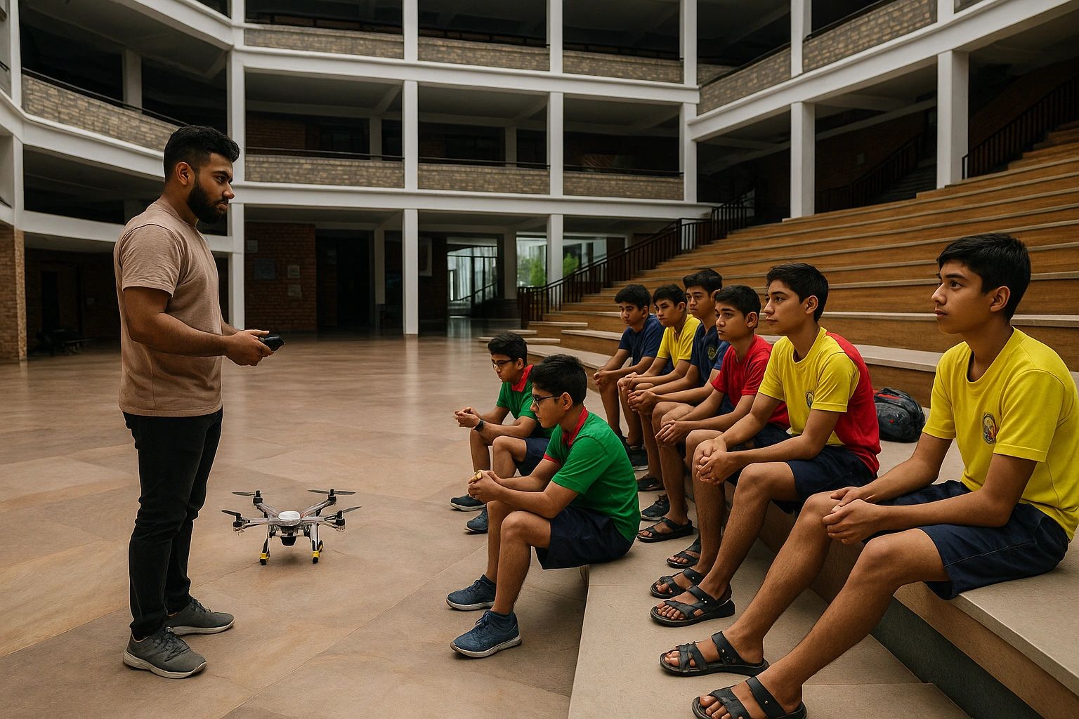 Students practice flying drones manually, learning takeoff, landing, directional control, and mid-air balance. This builds confidence, precision, and responsible flying skills.